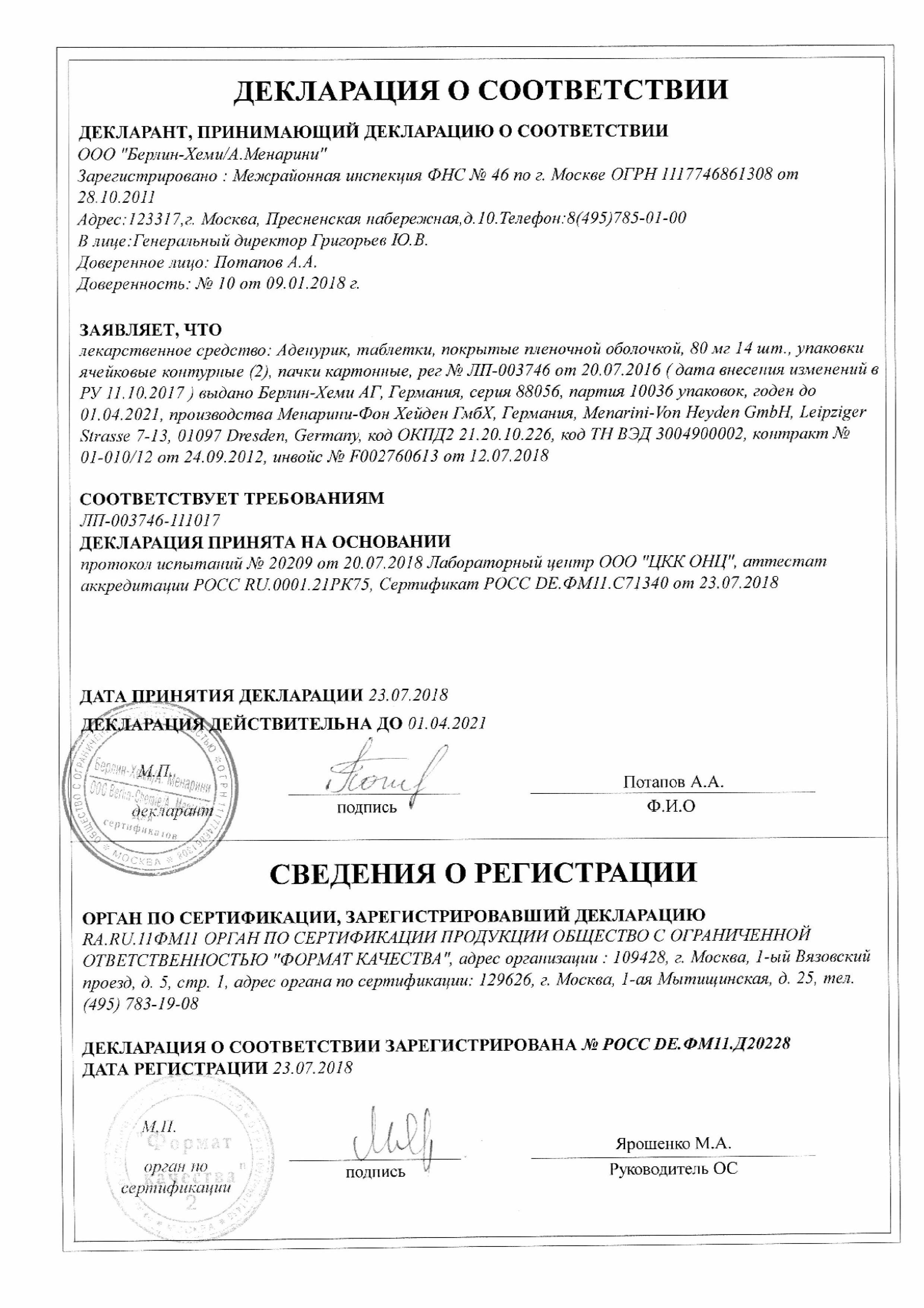 В случае возникновения тяжелых аллергических реакций/реакций гиперчувствительности, включая синдром Стивенса-Джонсона, необходимо немедленно прекратить применение препарата Аденурик® (более ранняя отмена ассоциирована с лучшим прогнозом). Повторное применение препарата не рекомендуется.