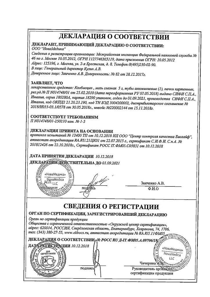 1 г мази глазной Колбиоцин содержит: хлорамфеникол 10 мг, колистиметат натрия 180 тыс.МЕ, тетрациклин 5 мг.
