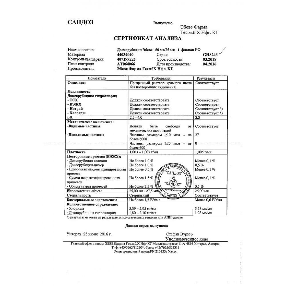 Инструкция по применению Доксорубицин Sandoz Medac (Словения/Австрия) 2мг/мл 25мл (50мг)