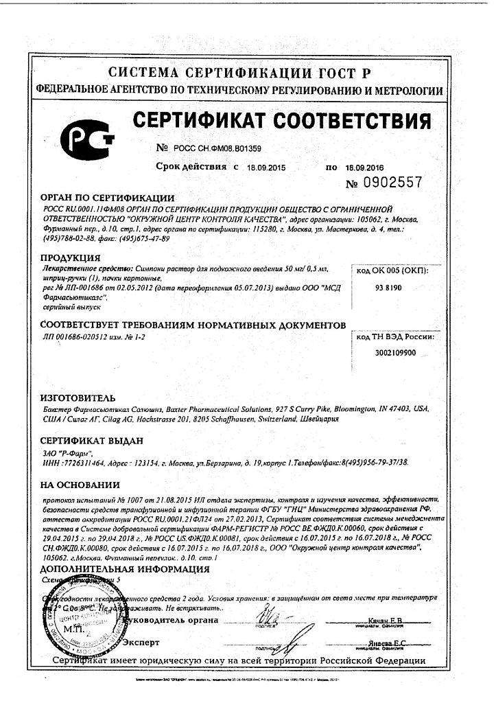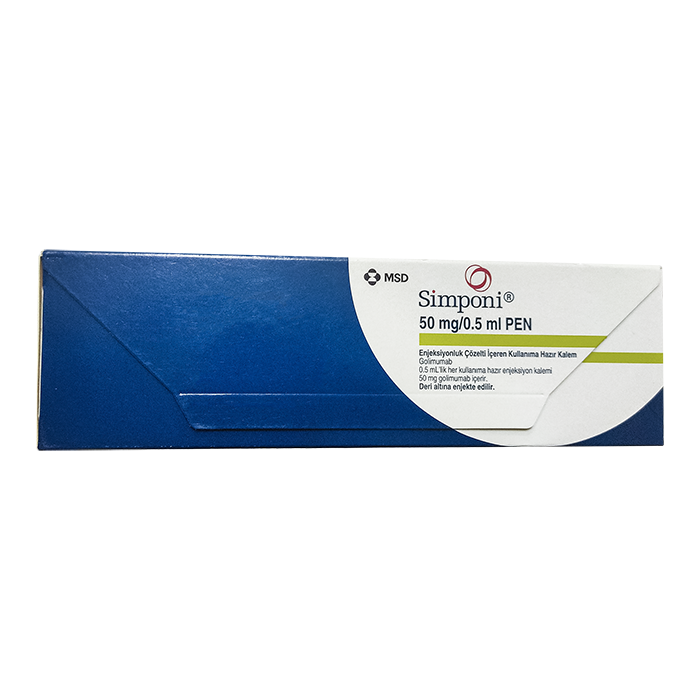 1 предварительно наполненный шприц или 1 предварительно наполнена ручка Симпони содержит: голимумабу 50 мг в 0,5 мл.