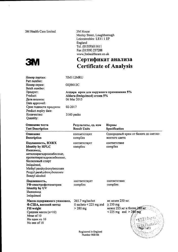 Применение. Крем Алдара применяют наружно. Наносится тонким слоем на предварительно очищенную поверхность кондиломы и аккуратно втирается в кожу до полного впитывания. Крем следует наносить только на пораженную область, избегая попадания на внутренние поверхности. Наносить крем Aldara следует 3 раза в неделю перед сном, и оставлять на коже, приблизительно, на 6-10 ч, в течение этого времени не следует принимать душ или ванну.