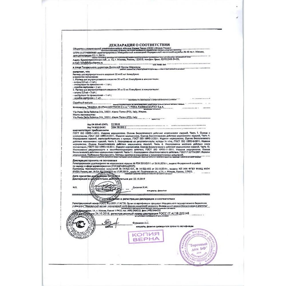 Гиалуроновая кислота эффективно метаболизируется в организме, быстро выводится из кровотока и быстро разрушается в печени. Метаболиты выводятся преимущественно с мочой. Около 42% введенной дозы определяют в печени через 24 ч после введения. Препарат определяется в синовиальной жидкости в пределах 2 ч, а в суставном хряще — 6 ч. Хрящ является наиболее постоянным местом локализации гиалуроновой кислоты. Гиалуроновая кислота содержится в синовиальной жидкости в течение 4–5 суток.