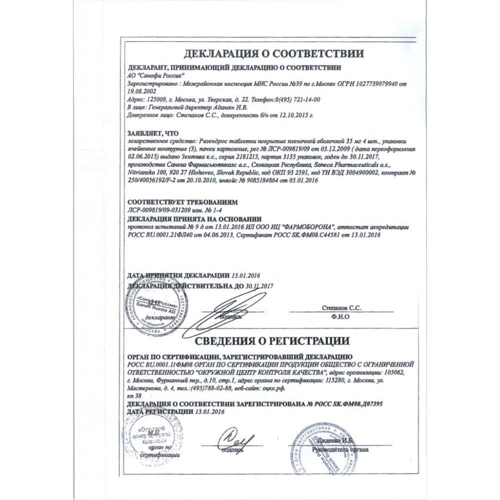 1 таблетка содержит ризедроната натрия 35 мг (эквивалентно 32,5 мг ризедроновой кислоты).