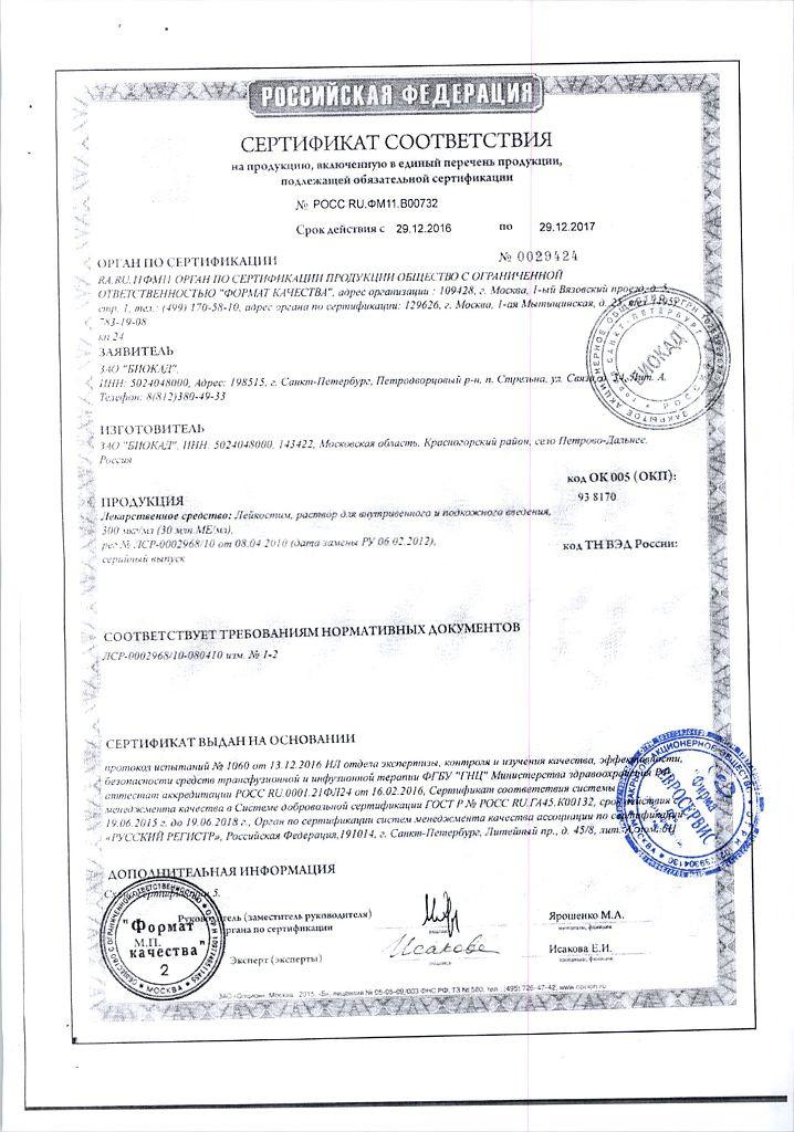 Прочие компоненты: декстран 60000, маннитол, кислота уксусная ледяная, ацетат натрия тригидрат, полисорбат 80, очищенная вода для инъекций.