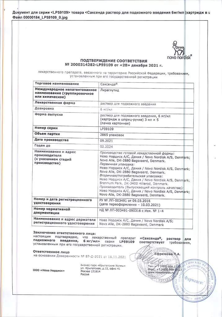 Действующее вещество препарата Саксенда® - лираглутид - представляет собой ацилированный аналог человеческого ГПП-1, произведенный методом биотехнологии рекомбинантной ДНК с использованием штамма Saccharomyces cerevisiae, имеющий 97% гомологичности аминокислотной последовательности эндогенному человеческому ГПП-1. Лираглутид связывается и активирует рецептор ГПП-1 (ГПП-1Р). Лираглутид устойчив к метаболическому распаду, его период полувыведения из плазмы после подкожного введения составляет 13 ч. Фармакокинетический профиль лираглутида, позволяющий вводить его пациентам 1 раз/сут, является результатом самоассоциации, в результате которой происходит замедленное всасывание препарата; связывания с белками плазмы; а также устойчивости к дипептидилпептидазе-4 (ДПП-4) и нейтральной эндопептидазе (НЭП).